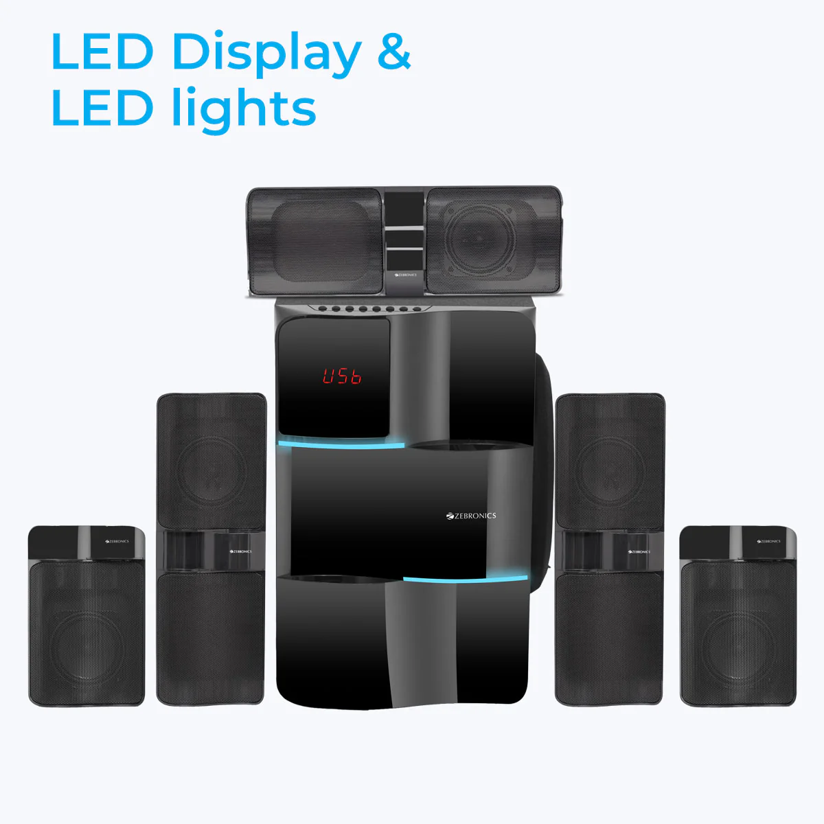 The 5.1 speaker has an LED Display and comes with controls for media, individual controls satellite and subwoofer volume. The subwoofer also comes with blue LED lights. |