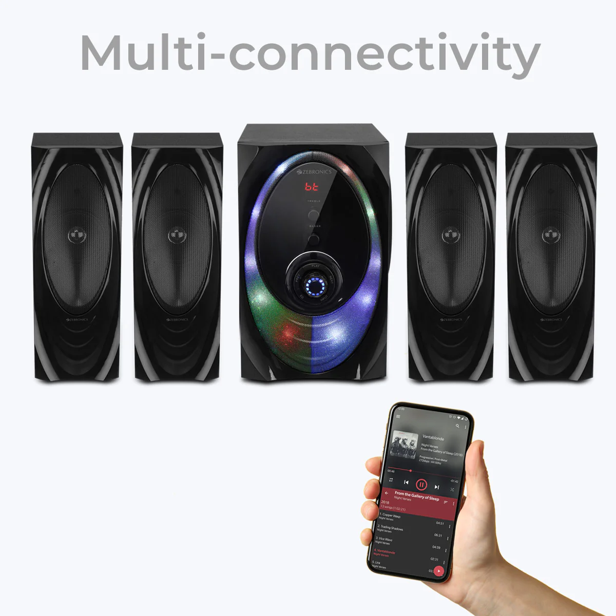 The 4.1 speaker has an LED Display and comes with controls for media/volume with individual controls for bass and treble. It also features the LED lights that elevate your audio experience further. |